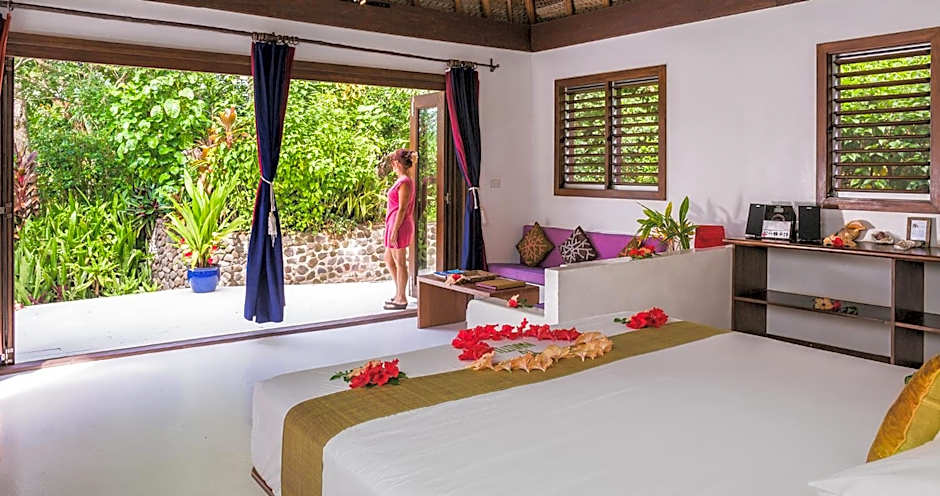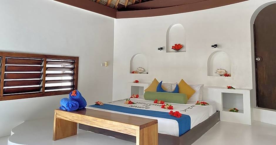 Located directly on the beach, this open-plan bure features an open ceiling and a traditional thatched roof. French Doors that open out to your own extended thatched deck. You can enjoy the views of the lagoon, watch the day go by from your own beach hammock or day bed or catch abit of sun on your beach sun loungers.
